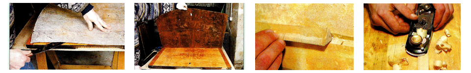 Nous décollons le placage d’acajou de l’abattant, avec un procédé qui nous est propre (tel une fresque que l’on dépose). Celui-ci est long et difficile mais il nous permet d’atteindre le support à consolider. L’âme de l’abattant en sapin laisse apparaître une fente que nous allons combler à l’aide d’une lame de bois (flipot). Après l’avoir collée et serrée pendant 8 heures, elle sera rabotée. Le placage sera alors jointé avec du papier gommé et fixé à nouveau à l’aide de colle de poisson. Il sera placé sous presse pendant plusieurs jours.